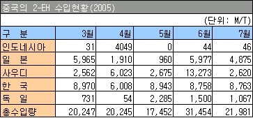 표, 그래프: | 중국의 2-EH 수입현황(2005) | <화학저널 2005/09/20> |
