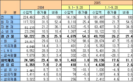 산자부, 9월 일본산 18.2% 증가 … 화학제품 수입 200억달러 상회 수입은 9월 1-20일 기준으로 고유가에 따른 원유 수입증가의 영향으로 원자재가 총수입의 57.4%를 차지하면서 전체 수입증가를 주도했다.원자재의 수입이 25.4% 증가했으며 자본재와 소비재는 각각 5.5%, 4.3% 감소했다. 산업자원부가 10월1일 발표한 <9월 수출입 동향> 잠정치에 따르면, 9월 수입은 226억5000만달러로 전년동월대비 24.5% 증가했다. 9월 수입은 1-20일 기준으로 고유가에 따른 원유 수입증가 영향으로 원자재 분야(수입비중 57.4%)가 전체 수입증가를 주도했다. 수입증가율은 9월 1-20일 기준 원자재가 25.4% 증가한 반면, 자본재는 5.5, 소비재는 4.3% 감소했다. 수입증가 주범으로 작용하고 있는 국제유가는 두바이유 기준 2005년 1월 배럴당 37.97달러에서 2월 39.91달러, 3월 45.85달러, 4월 47.21달러, 5월 45.41달러, 6월 51.06달러, 7월 52.84달러, 8월 56.77달러, 9월 56.75달러를 형성했다. 특히, 원유는 도입단가가 전년동월대비 무려 42.2% 상승함에 따라 수입액이 64.9% 폭증했다. 이밖에 석회석, 소금 등 비금속광물(28.8%), 합성수지(12.5%) 및 플래스틱제품(10.3%) 수입도 2자릿수 증가했다.