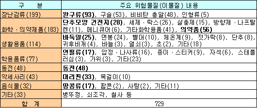 소보원은 영유아가 물건을 삼키는 사고를 예방하기 위해 어린이용품에 대한 안전기준 강화, 결함정보에 대한 보고제도 도입, 시판제품 조사 및 리콜 등 사후관리 강화, 가정 안전교육 등을 관계기관에 건의할 계획이다. 표, 그래프: | 영유아가 삼킨 위험물질의 종류 | <화학저널 2005/10/07> |