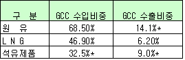 전경련은 중국과 아세안(ASEAN)의 FTA가 7월부터 발효됨에 따라 우리와 아세안간의 FTA 체결이 지연될수록 경제적 손실이 커질 우려가 있어 현재 진행중인 한국-아세안 협상의 조기타결을 위해 노력해야 한다고 강조했다. 전경련은 싱가폴, 인도네시아, 말레이지아, 타이, 필리핀, 브루나이 등 아세안 6개국 수입시장에서 우리나라의 시장점유율아 6.8%로 중국(12.1%)의 절반 수준이라고 지적했다. 표, 그래프: | 한국-GCC의 에너지 수출입 비중(2004) | <화학저널 2005/10/13> |