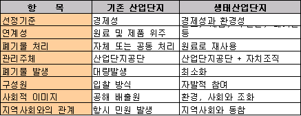 표, 그래프: | 기존산업단지와 생태산업단지 비교 | <화학저널 2005/10/19> |