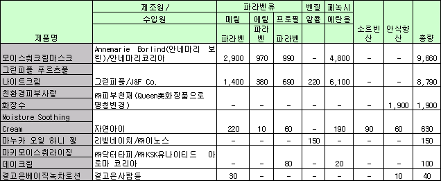 표, 그래프: | 천연화장품의 방부제 검출현황 | <화학저널 2005/11/01> |