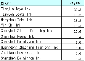 10대 메이저 중 6개가 일본기업 … 친환경 잉크로 중국시장 공략 중국 잉크시장에 일본기업의 진출이 가속화되고 있다.2004년 중국의 잉크 생산량은 28만톤에 달했고 10대 잉크 메이저의 생산이 전체의 41%를 차지했는데 10대 메이저 중 6개가 일본계 기업이며 4개만이 중국기업으로 나타났다. 2004년 중국의 잉크 수입량은 4만6000톤, 수출량은 1만5600톤으로 각각 16.8%, 44.4% 증가했으며 10대 메이저의 생산품목은 주로 Solvent 베이스 Offset잉크나 Gravure잉크인 것으로 알려졌다. 일본 Dainippon은 Coates Lorilleus를 인수하고 중국에 32개 지사를 설립했으며 신문용 Offset 및 Gravure잉크 외에도 코팅제, Ink Resin, 안료, LCD 소재, 식품첨가제 등을 폭넓게 다루고 있다. Toyo Ink는 중국 최대의 단일 플랜트를 보유하고 있으며 Shanghai Toyo Ink 등 6개의 메이커를 설립했는데 중국 최초로 생산량 2만톤을 돌파했고 2004년 수출이 20% 증가했다. Toyo Ink는 중국에 고속인쇄기용 대두유(Soybean Oil)잉크를 도입하기도 했다. Sakata Ink는 2004년 7월에, Maoming Sakata Ink는 2005년 7월에 중국에 진출했으며 친환경 대두유잉크 및 수성잉크 등 고부가가치 기술로 중국시장 공략에 나서고 있다. 800만달러가 투자된 Sakata Ink의 Shanghai 플랜트는 수성 Flexo잉크와 Solvent 베이스 Gravure잉크를 생산하며 Qingpu Industrial Park의 포장재용 잉크로 납품되고 있다. Maoming 플랜트는 대두유가 20% 함유된 Offset잉크 6000톤의 생산능력을 지니고 있는데 대두유 100% 잉크는 가격이 비싼 편이라 중국 내 도입은 시기상조인 것으로 판단되고 있다. Flint Ink는 700만달러를 투자해 2004년 Beijing에 신문용 인쇄잉크 플랜트를 건설했고 2005년 1월에는 수성 및 Solvent 베이스 포장용 잉크를 생산하는 자회사를 Guangzhou에 설립했다.