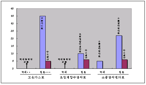 표, 그래프: | 수소 생산을 위한 초고온가스로(VHTR)의 계통도 | 원자력 수소 관련 한국ㆍ일본 특허 출원건수(수소시스템 포함) | <화학저널 2005/11/04> |