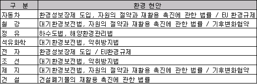 EU는 특정유해물질 사용제한지침(RoHS), 전기ㆍ전자장비 폐기물 처리지침(WEEE), 폐자동차 처리지침(ELV), 에너지 사용제품 친환경설계 규정(EuP) 등을 시행중이거나 시행할 예정이다. 그러나 국내에서는 대기업을 중심으로 에코파트너인증제(삼성전자) 및 친환경인증제(LG전자) 등을 통해 협력기업의 유해물질을 관리하고 있으나 중소기업의 전문인력 부족 등 대응여건이 매우 열악한 실정이다. 상의는 보고서에서 EU 환경규제, 교토의정서상의 의무준수 등 대외적으로도 부담이 가중되는 실정이며, 환경규제를 양산하는 것보다 국내기업의 자율적인 참여를 유도하기 위한 정책을 강화해야 한다고 주장했다. 표, 그래프: | 주요 산업의 환경현안 | <화학저널 2005/11/09> |