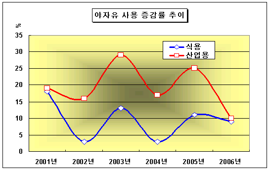 표, 그래프: | 야자유 사용 증감률 추이 | <화학저널 2005/11/11> |