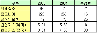 Mosaic에 따르면, DAP의 현금거래가는 전년대비 19%, 32달러 높은 가격인 톤당 201달러에, 질소비료 매출은 46% 하락한 327만달러에 거래됐다. 2004년 말 Potash Corp.은 Rocanville 플랜트 가동으로 전세계 칼륨비료의 86%인 40만톤을 여분으로 보유하고 있는 상황이다. Merrill Lynch에 따르면, 봄철 비료수요량이 많아지고 대두 가격이 상승으로 인한 2/4-3/4분기 남미 수요량증가로 칼륨비료 사용량은 더욱 많아지리라 예상된다. 한편, 칼륨 재고 및 수급은 상당히 타이트해 1/4분기 캐나다산 칼륨 수출이 브라질산보다 유리하게 거래됐다. 표, 그래프: | 미국의 비료ㆍ천연가스 가격 변화 | <화학저널 2005/11/18> |
