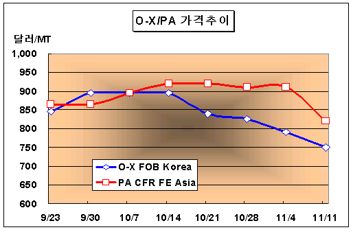 아시아 PA 시장은 업스트림인 O-X와 다운스트림인 DOP(Dioctyl Phthalate) 가격약세로 부진을 면치 못했다. <김건우 기자> 표, 그래프: | O-X/PA가격추이 | <화학저널 2005/11/18> |