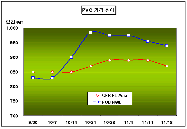 CFR FE Asia 860-880달러 형성 … 유럽은 940달러로 15달러 떨어져 PVC(Polyvinyl Chloride) 가격은 11월16일 CFR FE Asia 톤당 860-880달러로 20달러 하락했다.아시아 PVC 시장은 국제유가 및 에틸렌(Ethylene) 가격하락과 중국의 수요감소로 하락세를 면치 못했다. 국제유가는 11월18일 서부텍사스중질유(WTI) 선물가격이 배럴당 56.14달러로 전일대비 0.20달러, Dubai유 현물가격이 배럴당 50.20달러로 전일대비 0.68달러 하락했고 에틸렌 가격은 FOB Korea 톤당 720-740달러로 25달러 하락했다. 중국 내수가격은 에틸렌 베이스가 톤당 6800위안으로 150위안 폭락했고 카바이드(Carbide) 베이스가 톤당 6400위안을 형성했다. 일본 VEC(Vinyl Environmental Council)에 따르면, 일본은 10월 PVC 5만7000톤을 중국에 수출했으며 부가가치가 높아 중국 내 수요전망이 밝은 것으로 알려졌다. CFR SE Asia 가격은 톤당 880-900달러를 형성했고 인도네시아 PT Sulfindo Adiusaha의 PVC 3만톤 플랜트는 11월 초 3주간의 정기보수에 돌입한 것으로 알려졌다.