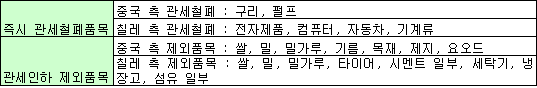 중국-칠레 FTA는 중국시장에서 국내기업들에게 큰 피해가 없을 것으로 예상되는데, 한국과 칠레의 중국 수출제품의 경합관계가 크지 않기 때문이다. 반면, 칠레시장 내 컴퓨터 관련 제품, 가전 및 자동차 등 공산품 위주로 중국산 제품과의 경쟁이 심화될 것으로 전망되며 특히, 중저가 제품에 대한 경합이 클 것으로 전망된다. 한국-칠레 FTA 이후 한국은 자동차, 석유제품, 합성수지, 칼라 TV 등이 주요 수출품목을 형성하면서 칠레시장에서 한국산 제품의 비중을 높여나가고 있다. 그러나 앞으로는 관련제품의 원료를 생산하는 국내 석유화학기업들의 채산성이 악화될 것으로 판단된다. 전기ㆍ전자, 자동차는 국내기업들이 해외로 공장을 이전하고 있고, 중국산 저가제품 공세에 밀려 가전제품의 하우징(Housing) 및 자동차 부품 소재로 사용되는 PS(Polystyrene), ABS(Acrylonitrile Butadiene Styrene) 시장이 위축될 것으로 예상되고 있다. 이에 따라 제일모직, LG화학, 금호석유화학 등의 피해가 우려된다. 국내에서는 사양산업인 섬유산업 역시 국내수요가 부족해 수출에 많이 의존해왔지만 중국-칠레의 FTA로 인해 수출 또한 악화될 것으로 보여 섬유제품에 사용되는 폴리에스터(Polyester) 시장의 위축이 전망된다. 표, 그래프: | 중국-칠레 FTA 주요 품목별 예상 관세양허안 | FTA 발효에 따른 칠레의 중국 수입증가 예상액 | <화학저널 2005/11/23> |