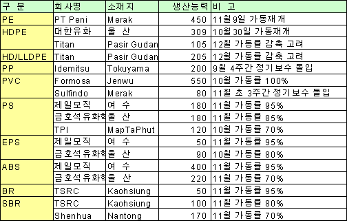 LDPE(Low-Density PE) 가격은 11월16일 CFR FE Asia 톤당 1100-1120달러로 65달러 급락해 가장 큰 하락폭을 보였고 LLDPE(Linear Low-Density PE)는 톤당 1060-1070달러로 55달러 급락해 톤당 1100달러대가 무너졌으며 HDPE(High-Density PE) Injection 그레이드는 톤당 1000-1020달러로 45달러 하락해 1000달러대 붕괴가 우려되고 있다. PP Homo 그레이드는 톤당 1060-1070달러로 11월11일 50달러 급락 후 재차 5달러 하락했으며 PVC 가격은 11월16일 CFR FE Asia 톤당 860-880달러로 20달러 하락했다. 이에 따라 말레이지아 Titan의 Pasir Gudang 소재 HD/LLDPE 20만5000톤, HDPE 10만5000톤, LDPE 22만톤 플랜트는 12월 가동률 감축을 검토하고 있으며 타이 TPE의 MapTaPhut 소재 LDPE 10만톤, LLDPE 30만톤, HDPE 52만톤, HD/LDPE 12만톤 플랜트는 11월 중순 45일간의 정기보수를 계획하고 있는 것으로 알려졌다. 인도네시아 PT Sulfindo Adiusaha의 PVC 3만톤 플랜트는 11월 초 3주간의 정기보수에 돌입한 것으로 나타났다. 표, 그래프: | 아시아 주요 폴리머 플랜트 가동현황(2005) | <화학저널 2005/11/23> |