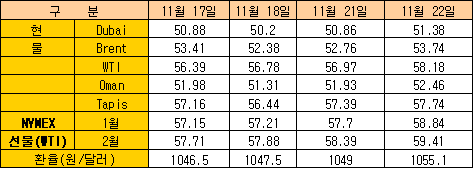 11월11일 51.38달러로 0.52달러 상승 … WTIㆍBrent 모두 상승 미국 동북부 지역의 기온이 낮아질 것이라는 예보에 따라 두바이(Dubai)유를 비롯한 국제유가가 2일 연속 상승세를 나타냈다.한국석유공사에 따르면, 11월22일 거래된 중동산 두바이유 현물은 배럴당 51.38달러로 전날보다 0.52달러 올랐다. 미국의 WTI(서부텍사스 중질유) 현물도 배럴당 1.21달러 오른 58.18달러, 북해산 Brent유는 0.98달러 상승한 53.74달러에 거래를 마감했다.