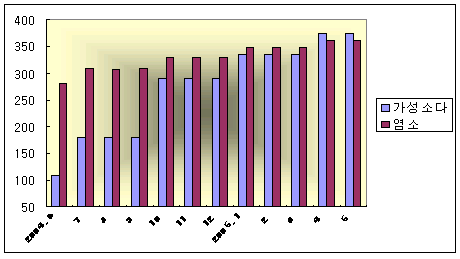 북미기업들은 염소 수요신장률이 기대에 부응해 수급이 타이트해지자 염소가격을 4월 FOB 톤당 345-375달러로 20달러 인상했다. MDI(Methylene di-para-Phenylene Isocyanate)와 농업을 포함한 일부부문 수요가 2004년보다 높았기 때문이다. 표, 그래프: | CA CP가격 추이 | <화학저널 2005/11/30> |
