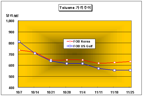 FOB Korea 630-638달러로 9달러 상승 … 미국은 보합세 톨루엔(Toluene) 가격은 11월25일 FOB Korea 톤당 630-638달러로 9달러 상승했다.아시아 톨루엔 시장은 미국시장 가격약세에도 국제유가 상승 및 벤젠(Benzene)가격 호조로 전주의 상승세를 계속 이어갔다. 국제유가는 11월22일 서부텍사스중질유(WTI) 선물가격이 배럴당 58.84달러로 전일대비 1.14달러, Dubai유 현물가격이 배럴당 51.38달러로 전일대비 0.52달러 상승했으며 벤젠가격은 11월25일 FOB Korea 톤당 630-640달러로 7달러 상승했다. CFR China 가격은 톤당 650-660달러로 최고가를 기록했으며 CFR SE Asia 가격은 톤당 645-660달러에 마감됐다.