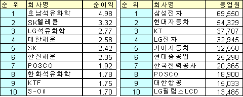3/4분기 5억원으로 선두 … LG석유화학ㆍ한화석유화학도 양호 호남석유화학이 2005년 3/4분기 종업원 1인당 순이익 1위를 차지했다.한국상장회사협의회가 발표한 <2005년 3/4분기 종업원 수 및 생산성 현황>에 따르면, 호남석유화학은 종업원 1인당 순이익 1위, 종업원 1인당 영업이익 3위를 차지해 생산성 우위를 나타냈다. 종업원 1인당 매출액 3위를 차지한 S-Oil은 1인당 영업이익 8위, 1인당 순이익 10위를, 1인당 매출액 4위 SK는 1인당 영업이익 9위, 1인당 순이익 5위를 차지했다. LG석유화학은 종업원 1인당 매출액 8위, 1인당 영업이익 2위, 1인당 순이익 3위에 올랐고 SK네트웍스와 LG상사가 각각 1인당 매출액 1, 2위에 랭크됐다.