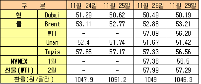 한국석유공사에 따르면, 11월29일 뉴욕상업거래소(NYMEX)의 WTI(서부텍사스 중질유) 선물유가는 전일대비 배럴당 0.86달러 하락한 56.50달러, 영국 국제석유거래소(IPE)의 Brent 선물유가는 0.56달러 하락한 54.32달러에 거래가 종료됐다.