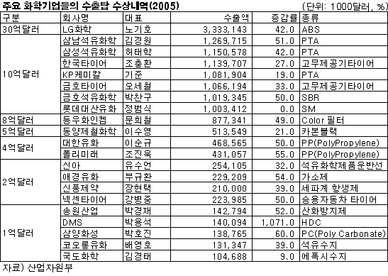 화학기업 수출실적 호조 … 수출실적 10억달러 달성 7사 달해 LG화학이 30만달러 수출을 달성했다.LG화학은 2004년 7월1일-2005년 6월30일 기준 33억달러를 수출함으로써 42.0%의 수출증가율을 달성해 11월30일 개최된 무역의 날 기념식에서 30억달러 수출탑을 수상했다. 이밖에도 삼남석유화학, 삼성석유화학, KP케미칼, 금호석유화학, 롯데대산유화가 10억달러 수출탑을, 동우화인켐이 8억달러 수출탑을 수상했다. 또 금호석유화학은 금탑산업훈장을, 삼남석유화학이 은탑산업훈장을, 애경유화가 동탑산업훈장을, 신풍제약이 철탑산업훈장을, KG케미칼이 석탑산업훈장을 수상하는 등 화학기업들의 약진이 돋보였다.