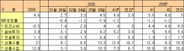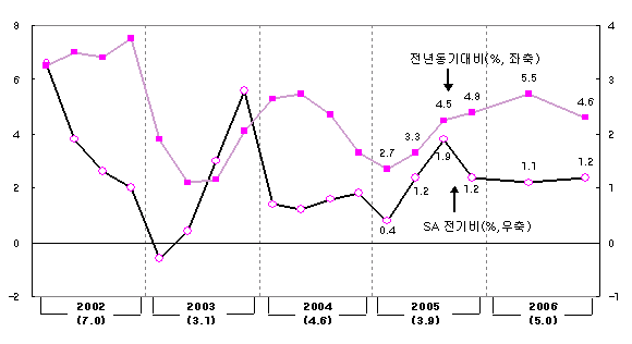 한국은행, 국제유가 강세 지속으로 … GDP 성장률은 5.0% 한국은행이 2006년 우리나라의 경제성장률을 5.0%로 전망했다.한국은행은 12월6일 발표한 <2006년 경제전망>에서 2006년 국내총생산(GDP) 기준 경제성장률이 상반기 5.5%, 하반기 4.6% 등으로 연간 5.0%에 달해 2005년 3.9%보다 비교적 큰 폭으로 상승할 것으로 예측했다.