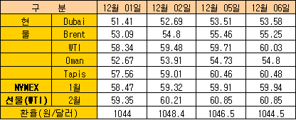 12월6일 53.58달러로 0.07달러 상승 … Brent는 55.25달러로 하락 배럴당 53달러를 돌파했던 두바이(Dubai)유 가격이 12월6일에는 보합세를 나타냈다.한국석유공사에 따르면, 12월6일 거래된 중동산 두바이유 현물가격은 배럴당 53.58달러로 전날보다 0.07달러 상승했다. WTI(서부텍사스 중질유) 현물도 배럴당 60.03달러로 전날보다 0.32달러 올랐으나, Brent유 현물가격은 배럴당 55.25달러로 0.21달러 하락했다.