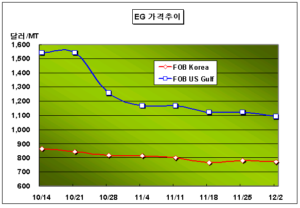 FOB Korea 770-775달러로 7달러 하락 … 미국은 33달러 급락 MEG(Mono-Ethylene Glycol) 가격은 12월2일 FOB Korea 톤당 770-775달러로 7달러 하락했다.아시아 MEG 시장은 중국 폴리에스터(Polyester) 섬유 부문의 수요 감소와 12월 아시아 계약가격(CP) 약세로 고전을 면치 못하고 있다. 12월 아시아 계약가격은 MEGlobal, Shell, Sabic 모두 CFR Asia 톤당 850달러를 고시해 전월대비 각각 170달러, 170달러, 90달러 인하됐다. 중국 내수가격은 ex-Tank 톤당 7600-7700위안을, 동남아 가격은 CFR SE Asia 톤당 770-775달러를 형성했다. 지속적인 채산성 악화로 말레이지아 Optimal의 Kertih 소재 MEG 38만5000톤 플랜트는 2006년 1월 75일간의 정기보수에 돌입할 것으로 알려졌다.