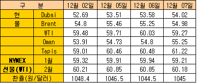 한국석유공사에 따르면, 12월7일 거래된 중동산 두바이유 현물가격은 배럴당 54.02달러로 전날보다 0.44달러 상승했다.