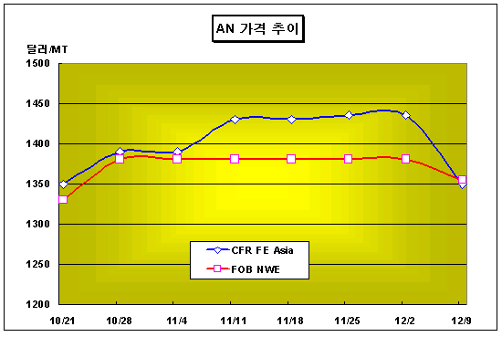 CFR FE 1350-1365달러 형성 … 유럽은 1355달러로 25달러 하락 AN(Acrylonitrile) 가격은 12월9일 CFR FE 톤당 1350-1365달러로 80달러 폭락했다.아시아 AN 가격폭락은 중국의 수요 감소와 재고 증가가 원인으로 지적되고 있다. AN 가격은 생산기업들의 공급 감축으로 4주간 1440달러대를 유지해 왔으나 12월부터 무역상들이 공급가격을 CFR FE Asia, SE Asia 톤당 1365달러로 낮게 책정했다. 그러나 아시아 국가들의 재고물량이 충분해 AN 가격은 CFR FE Asia 톤당 1350달러, CFR SE Asia 톤당 1360달러까지 하락했다. 아시아의 AN 생산기업들은 가격을 CFR Asia 톤당 1400달러로 회복시키기 위해 공급을 감축하고 있는 것으로 알려졌다.