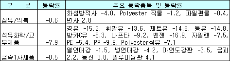 섬유ㆍ의복 및 가죽제품은 원면 국제가격 상승으로 면사, 면직물, 셔츠 등이 올랐으나 국제유가 하락으로 화섬방적사, Polyester직물, 파일편물 등이 내려 0.6% 하락했다.