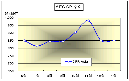 MEG(Mono-Ethylene Glycol) 2006년 1월 계약가격(CP)이 CFR Asia 톤당 850달러를 형성했다.