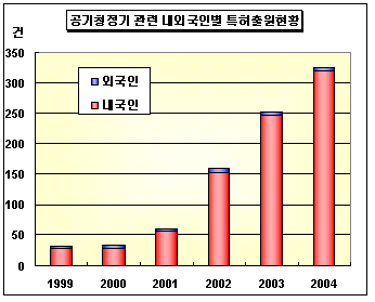특허청, 공기청정기 특허출원 59% 증가 … 여과기술이 297건으로 55% 새집증후군과 웰빙 트랜드에 따라 공기청정기 수요가 증가하고 특허 출원도 늘고 있다.특허청에 따르면, 공기청정기 특허는 1999-2004년 5년간 총 863건이 출원됐는데 1999년에는 32건이 출원됐고 2001년에는 61건, 2002년 160건, 2003년 325건이 출원됨으로써 공기청정기 관련 특허 출원은 연평균 59% 증가했다. 총 863건 중 내국인 출원은 834건인 96.6%으로 생활환경 개선으로 건강에 대한 관심이 높은 것이 반영된 것으로 판단된다.