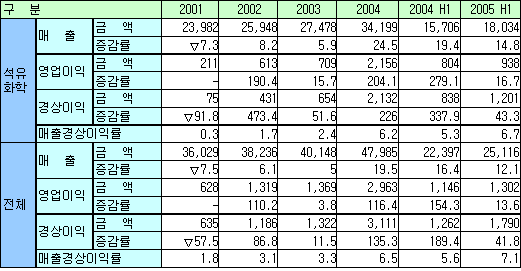 영업이익도 가격인상과 합리화에 따라 비연결 영업이익이 16.7% 증가한 938억엔, 연결 영업이익이 14.0% 증가한 1497억엔으로 2자릿수 증가했다. 해외시장에서도 호조를 나타내 비연결 경상이익이 43.3% 증가한 1201억엔으로 영업이익을 크게 웃돌았다. 다만, 범용수지 전문 생산기업을 포함하면 연결 매출액영업이익률이 5.7%로 2004년의 7.2%, 2004년 상반기의 6.1%보다 하락하는 등 나프타 가격 급등으로 인한 코스트 상승을 완전히 전가하지 못한 것으로 판단된다. 그러나 합성수지 원료 등 Upstream 제품의 호조와 해외공급 확대로 11사의 전체 매출액경상이익률은 6.7%로 사상 최고수준에 달했다. 하지만, 아시아 석유화학 시장은 가을부터 약세를 보이기 시작했고 나프타 등 원료가격도 9월 이후 예상치 못한 급등을 이어가고 있어 수익률이 상반기에 비해 하락할 것으로 예상되고 있다. 표, 그래프: | 일본 NCC 11사의 석유화학 수익 변화 | <화학저널 2005/12/19> |