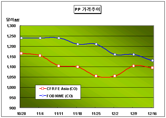 CFR FE Asia 1090-1100달러 형성 … 유럽은 30달러 하락 PP 가격은 Block Copolymer 기준 12월14일 CFR FE Asia 톤당 1090-1100달러로 10달러 하락했다.아시아 PP(Polypropylene) 시장은 업스트림인 프로필렌(Propylene) 가격상승에도 중국을 비롯한 아시아 수요기업들의 관망세로 하락세를 면치 못했다. 프로필렌 가격은 12월16일 FOB Korea 톤당 820-830달러로 20달러 상승했으며 CPC의 Kaohsiung 소재 에틸렌 50만톤, 프로필렌 25만톤 No.5 크래커가 불가항력을 선언하고 12월15일 15일간의 수리작업에 들어갔으나 PP 가격상승을 견인하지 못한 것으로 나타났다. IPP Flim 그레이드는 CFR FE Asia 톤당 1060-1070달러, Raffia/Injection 그레이드는 톤당 1050-1060달러를 형성했고 동남아 가격은 Block Copolymer 기준 CFR SE Asia 톤당 1080-1090달러에 마감됐다. 그러나 중국 내수가격은 Raffia/Injection 기준 ex-Works 톤당 1만900-1만1000위안으로 500위안 폭등한 것으로 알려졌다.