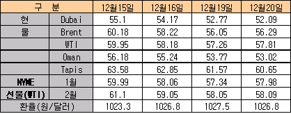 12월20일 52.09달러로 0.68달러 하락 … Brent는 0.24달러 상승 두바이(Dubai)유 가격이 4일 연속 하락했으나 Brent 및 WTI는 상승세로 전환됐다.한국석유공사에 따르면, 12월20일 거래된 중동산 두바이유 현물가격은 배럴당 52.09달러로 전일대비 0.68달러 하락했다. 그러나 WTI(서부텍사스 중질유)는 배럴당 57.81달러로 0.55달러 상승했으며, Brent유는 0.24달러 상승한 56.29달러에 거래됐다. 뉴욕상업거래소(NYME)의 WTI 선물유가도 1월물 기준으로 배럴당 0.64달러 오른 57.98달러에 마감됐다.