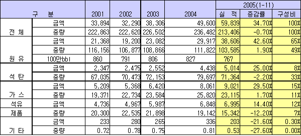 관세청에 따르면, 국내 에너지 수입액은 2005년 1-11월 598억달러로 12월 예상분을 감안하면 연간으로는 660억달러를 넘어설 전망이다. 2004년 496억달러에 비해 33% 가량 급증한 것으로 2004년 세웠던 사상 최대기록을 크게 뛰어넘는 수준이다.