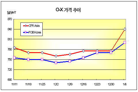 중국의 PA 메이저들은 2005년 7월 이후 가동률을 70-75%로 유지해왔다. <박경수 기자> 표, 그래프: | O-X 가격추이 | <화학저널 2006/01/12> |