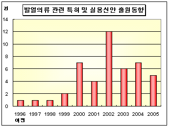 2005년까지 발열의류와 관련한 특허 및 실용신안출원은 모두 46건으로 2002년 이후 연평균 약 8건씩 출원되고 있다. 발열방식별로는 전열선을 이용한 방식이 전체의 약 33%를 차지하고 있고, 면상발열체를 이용한 방식이 28%, 전도성섬유를 이용한 방식이 26%, 상변화물질 이용 및 공급관으로 이루어진 방식이 13%를 차지하고 있으나, 최근 들어 열전소자를 이용해 자동적으로 온도가 조절돼 쾌적한 난방이 이루어질 수 있는 방식이 출원되고 있다. 세탁이 가능한 방한용 발열의류는 건강증진에 상당히 유익한 맥반석, 황토, 옥분말 등으로 이루어진 피복재로 열선을 덮은 전열선을 만들어 움직임이 발생되지 않도록 내장한 후 내장된 전열선의 열선 외부 노출부위를 절연체로 피복하며 밧데리를 부착하여 전열선으로 전원을 공급 할 수 있게 했다.