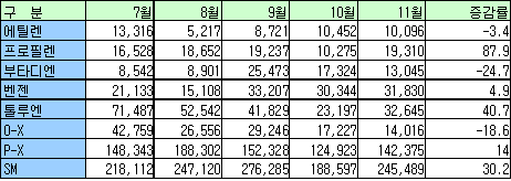 11월 프로필렌 87.9%에 톨루엔 40.7% 증가 … 부타디엔 24.7% 감소 중국의 프로필렌(Propylene) 및 톨루엔(Toluene) 수입이 급증했다.중국 관세청에 따르면, 2005년 11월 프로필렌 수입은 87.9% 증가한 1만9310톤, 톨루엔 수입은 40.7% 증가한 3만2645톤에 달한 반면, 부타디엔(Butadiene) 수입은 24.7% 감소해 1만3045톤에 그쳤다. 프로필렌은 PP(Polypropylene) 수요 증가, 톨루엔은 아시아 주요 BTX 플랜트의 정기보수가 완료됨에 따라 급증한 것으로 판단되는 반면, 부타디엔은 2005년 9월 수입급증으로 재고량이 충분해 감소한 것으로 해석된다.