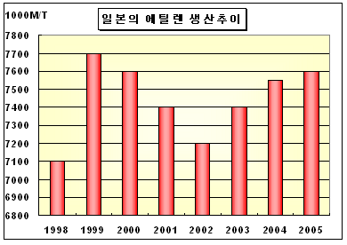 일본의 2005년 에틸렌(Ethylene) 생산량은 761만9000톤으로 2004년에 비해 0.7% 증가했다.
