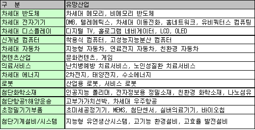 지속적 성장을 위해 육성할 미래 유망산업으로 차세대 메모리ㆍ비메모리 반도체, 바이오 신약ㆍ장기, 차세대 이동전화 등이 선정됐으며 첨단화학소재로서 인공지능 폴리머, 전자정보용 정밀화학 소재, 친환경 화학소재, 나노소재 등이 선정됐다.