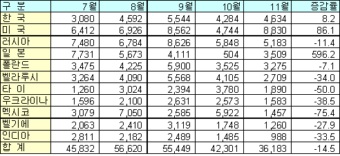2005년 11월 14.5% 줄어 … 한국산 수입은 8.2% 증가 중국의 CPL 수입이 2005년 11월 14.5% 감소했다.중국 CPL 수입시장은 한국, 미국, 일본산 제품을 제외하고 전체적으로 뚜렷한 하락세를 나타냈으며 나일론섬유(Nylon Fiber) 부문의 가동률 저하를 반증했다. 나일론섬유를 비롯한 중국 섬유산업은 2005년 미국 및 유럽연합(EU)과의 섬유무역 분쟁에 큰 영향을 받았으며 1월 섬유무역 쿼터제가 폐지된 이후 5월 미국과 유럽연합이 중국산 섬유제품에 대한 세이프가드(긴급수입제한) 조치를 취해 정점에 달했다. 중국은 섬유무역 협상에 즉각 돌입했으며 유럽연합과는 6월, 미국과는 11월6일 협상이 타결됐으나 중국의 섬유 및 합섬원료 산업에 큰 타격을 준 것으로 나타났다. 게다가 허리케인 Katrina 및 Rita 쇼크 이후 암모니아(Ammonia) 가격이 폭등해 CPL 부문의 채산성은 더욱 악화됐던 것으로 파악되고 있다.