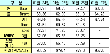 한국석유공사에 따르면, 1월27일 거래된 중동산 두바이유 현물가격은 배럴당 60.08달러로 전날보다 0.71달러 상승했다.