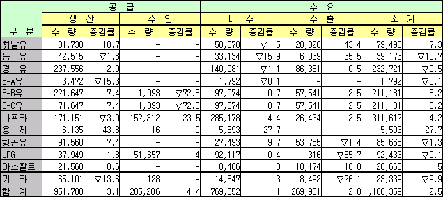 산자부, 수입 1억5231만배럴로 23.5% 급증 … 석유 소비는 미증 2006년도 석유 소비는 전년대비 1.1% 증가한 7억6900만배럴(하루 210만9000배럴)로 2005년에 이어 소폭 증가할 것으로 예상된다.산업자원부에 따르면, 나프타(Naphtha)ㆍLPG 소비는 증가하는 반면, 휘발유ㆍ등ㆍ경유 소비는 감소할 것으로 예상된다.