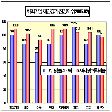 표, 그래프: | 화학기업 체감경기 전망지수(2006.02) |