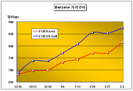 FOB Korea 810-820달러로 42달러 상승 … 미국은 22달러 상승 벤젠(Benzene) 가격은 2월3일 FOB Korea 톤당 810-820달러로 42달러 상승했다.아시아 벤젠 시장은 국제유가 강세와 미국시장 호조로 1월6일 상승세를 타기 시작한 이후 톤당 800달러 고지를 돌파했다. 국제유가는 2월3일 WTI(서부텍사스중질유) 선물가격이 배럴당 65.37달러로 전일대비 0.69달러 상승했고 Dubai유 현물가격은 배럴당 58.81달러로 1.46달러 하락했다. 특히, 유럽-미국 운송 코스트가 톤당 60달러를 상회해 상대적으로 저렴한 아시아산 제품의 미국 수출증가도 가격호조를 견인한 것으로 나타났다. CFR SE Asia 가격은 톤당 790-800달러, CFR Taiwan 가격은 톤당 835-845달러를 형성했다.