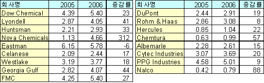 Wall Street의 애널리스트들과 ACC(American Chemistry Council)는 2006년 화학경기 호황을 예측하고 있는데 2006년 생산증가율은 화학제품 전체가 2.7%, 플래스틱 부문이 4.9%, 특수화학제품 부문이 3.8%를 기록하고 전체 가동률도 77.5%로 상승할 것으로 전망하고 있다.