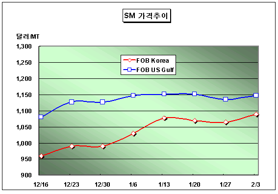 아시아 SM 시장은 중국의 춘절 연휴에도 불구하고 고유가와 업스트림 가격강세로 일부 지역은 톤당 1100달러를 돌파하는 등 호조를 보였다.