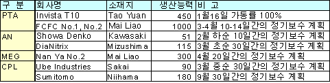 타이완ㆍ일본 주요 플랜트 줄줄이 가동중단 … 아시아 시세는 호조 아시아 주요 합섬원료 플랜트의 정기보수가 1/4분기 집중적으로 이루어진다.타이완 FCFC의 Mai Liao 소재 PTA(Purified Terephthalic Acid) No.1 50만톤, No.2 50만톤 플랜트는 3-4월 동시에 정기보수에 돌입하며 Invista의 Tao Yuan 소재 플랜트는 1월16일 정상가동률을 유지하고 있는 것으로 알려졌다. 일본 Showa Denko와 DiaNitrix의 AN(Acrylonitrile) 플랜트는 각각 2월 하순과 3월 초순 10일, 30일간의 정기보수에 들어갈 계획이다. 타이완 Nan Ya의 MEG(Monoethylene Glycol) No.2 30만톤 플랜트는 4월, 일본 Ube의 CPL(Caprolactam) 9만톤 플랜트는 3월 각각 정기보수를 앞두고 있다.