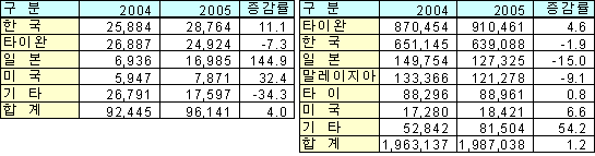 다만, 미국산은 전체적인 수입 감소세 속에서 유독 58.5% 급증하는 기염을 토해 눈길을 끌었다. 표, 그래프: | 중국의 HIPS 수입동향 | 중국의 ABS 수입동향 | 중국의 PVC 수입동향 | <화학저널 2006/02/07> |