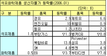 석유제품은 국제유가 상승의 영향으로 나프타가 2.3% 상승하는 등 오름세를 보여 전체적으로 1.8% 상승했다. 2006년 1월 생산자물가가 전월대비 0.6% 상승해 3달 만에 오름세로 반전됐다. 생산자물가 상승률은 2005년 10월 0.2%에서 11월 0.5%, 12월 0.2% 하락해 2달 연속 떨어졌으나 1월에는 오름세로 돌아섰다. 또 전년동월대비로는 2.1% 상승해 6개월만에 2%대의 상승률로 올라섰다. <김지은 기자> 표, 그래프: | 석유화학제품 생산자물가 등락률(2006.01) | <화학저널 2006/02/09> |