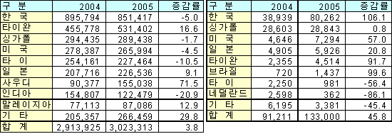 Homo 85만톤에 Copolymer 8만톤 선두 … LDPE 수출은 부진 한국산 PP(Polypropylene) 제품이 2005년 중국 수입시장을 석권한 것으로 나타났다.중국의 한국산 PP 수입은 Homopolymer 그레이드가 85만1417톤, Copolymer 그레이드가 8만262톤을 기록했으며 Copolymer 그레이드는 전년대비 106.1% 폭증해 국내 수출기업들의 수출전략이 주효했던 것으로 풀이된다. Homopolymer 시장에서는 타이완이 지역적인 이점을 바탕으로 한국을 바짝 추격했고 싱가폴이 미국을 누르고 3위로 부상한 반면 일본이 6위로 밀려 눈길을 끌었다. Copolymer 시장에서는 싱가폴이 2위를 고수했고 미국, 일본, 타이완이 3-5위 다툼에 격돌했으며 브라질산 수입이 99.6% 폭증해 중남미의 자존심을 지켰다.
