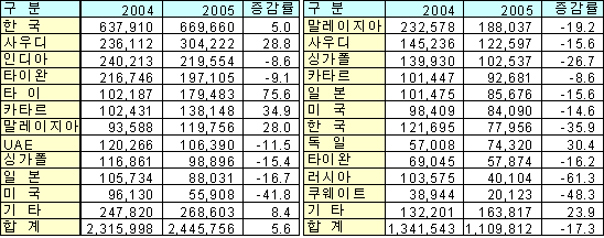 사우디는 HD/LDPE 모두 2위에 올랐으며 말레이지아, 싱가폴, 타이 등 동남아 국가들의 선전이 두드러진 것으로 나타났다. 표, 그래프: | 중국의 PP(Homo) 수입동향 | 중국의 PP(Co) 수입동향 | 중국의 HDPE 수입동향 | 중국의 LDPE 수입동향 | <화학저널 2006/02/09> |